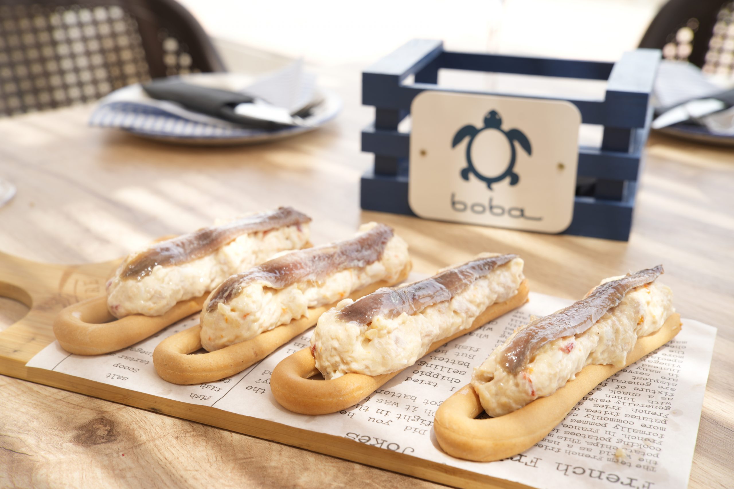 Tradicionales marineras hechas con nuestra ensaladilla, elaborada a diario, y una exquisita anchoa del Cantábrico, Rocas de lomos de bacalao Jumbo rebozadas, exquisitas croquetas premium…