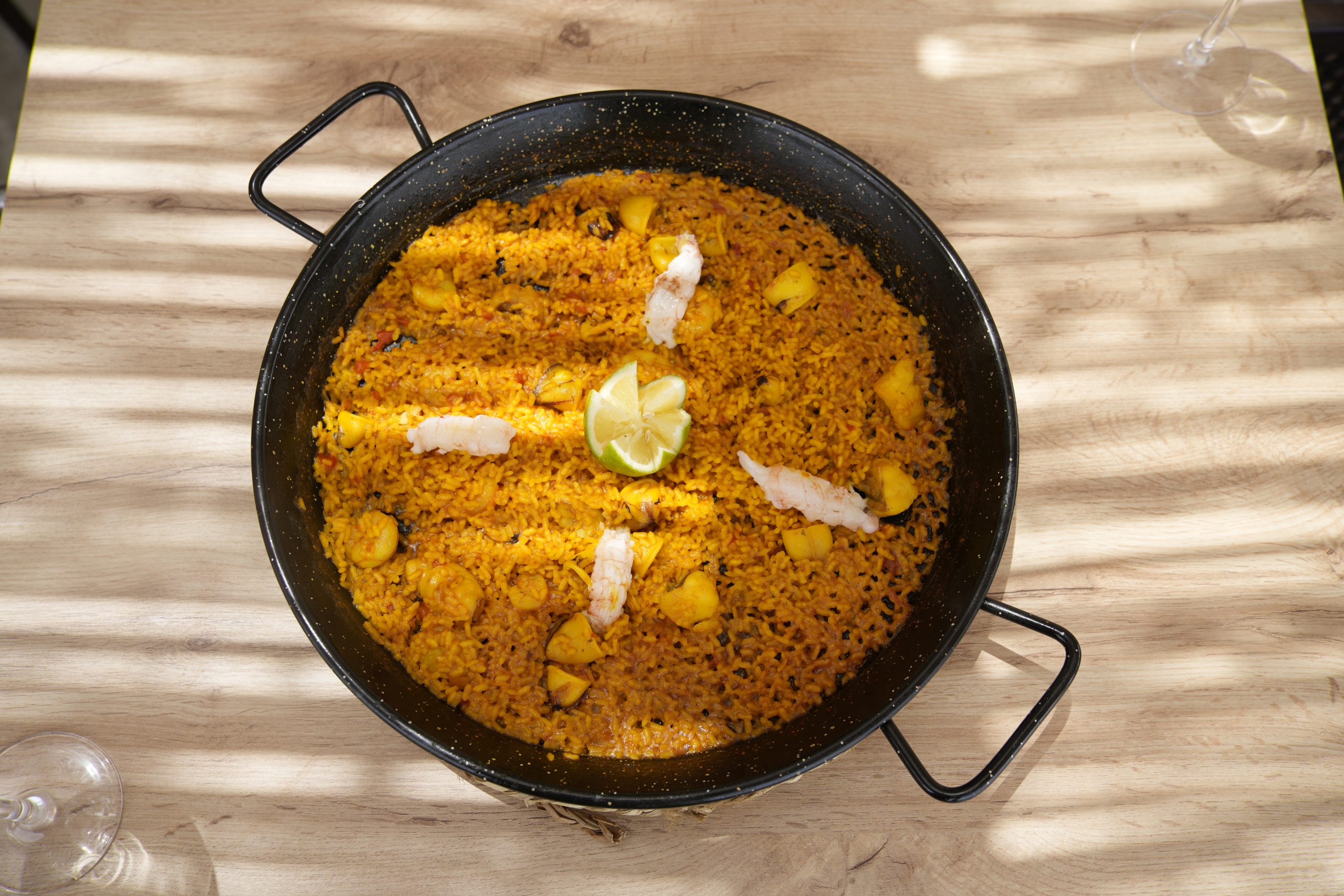 Fondo cocinado con los mejores pescados de roca y verduras del Campo de Cartagena, arroz bomba ecológico, gamba roja pelada, rape de Huelva y calamar troceado y unas exquisitas colas de cigala, hacen de este arroz un imprescindible en tu visita.